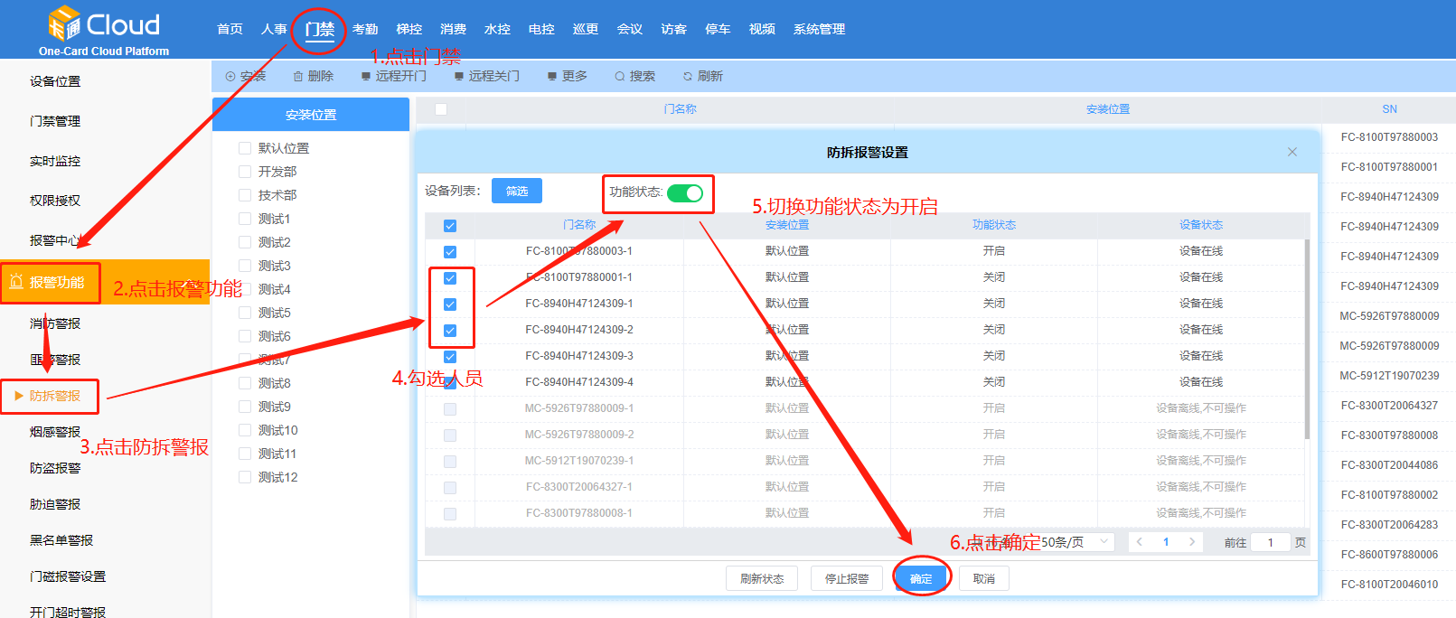 在【防拆警报】页面,勾选门禁-点击【开启】或【关闭】。如下图所示: