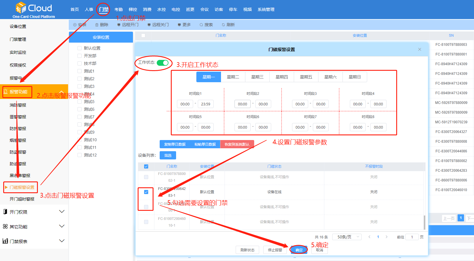 在【门磁报警】页面,勾选门禁-【设置】-切换【工作状态】-》》设置门磁报警参数-点击【确定】。如下图所示: