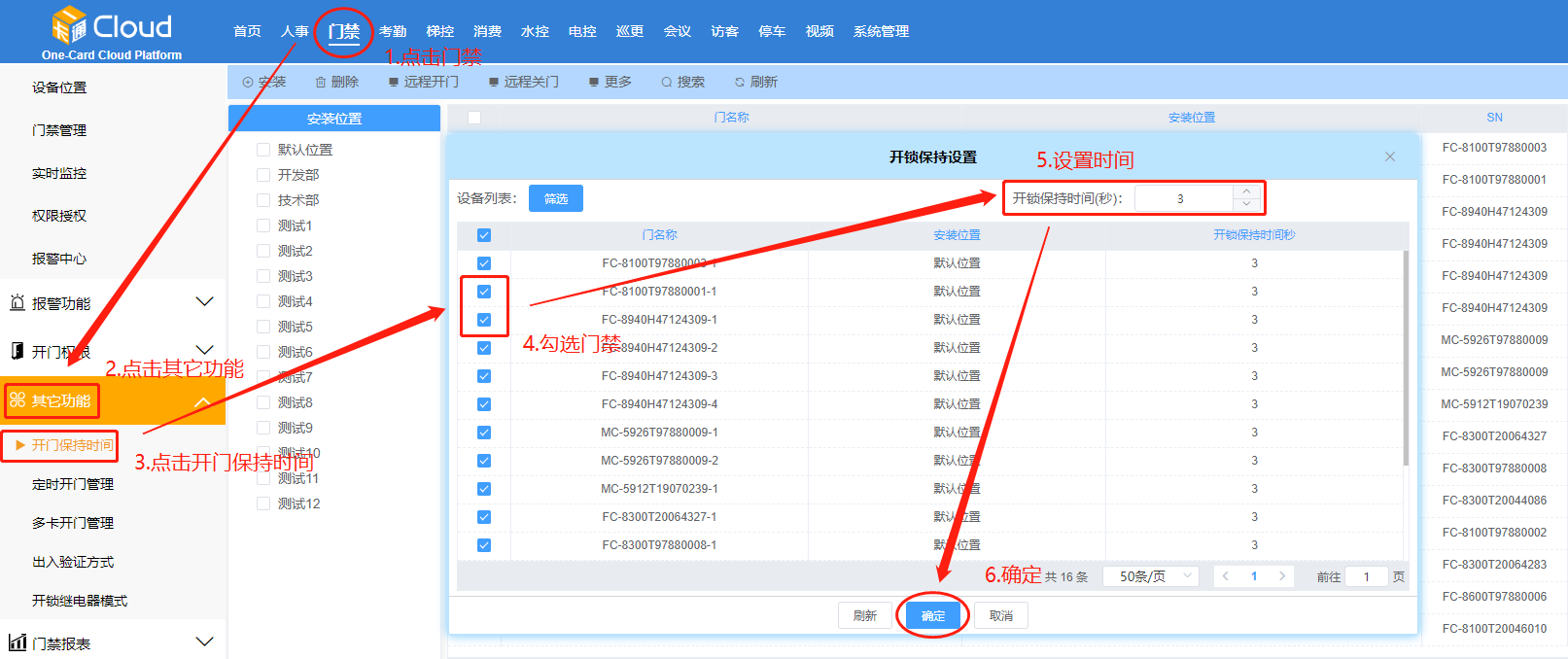 点击【门禁】-【其它功能】-【开门保持时间】。如下图所示: