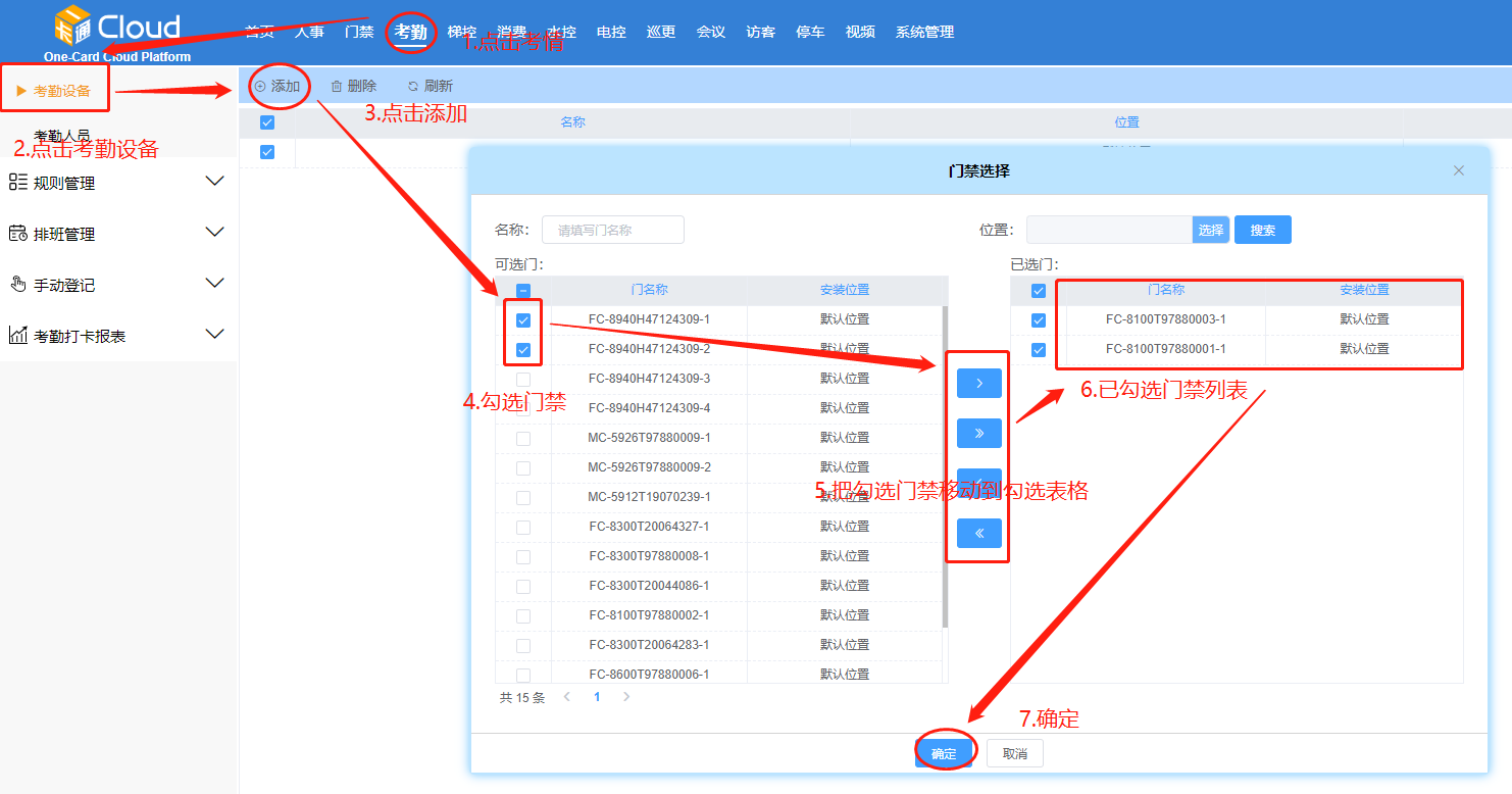 点击【考勤】-【考勤设备】-【添加】-勾选门禁-移动勾选门禁到已选列表-点击【确定】。如图20-1所示: