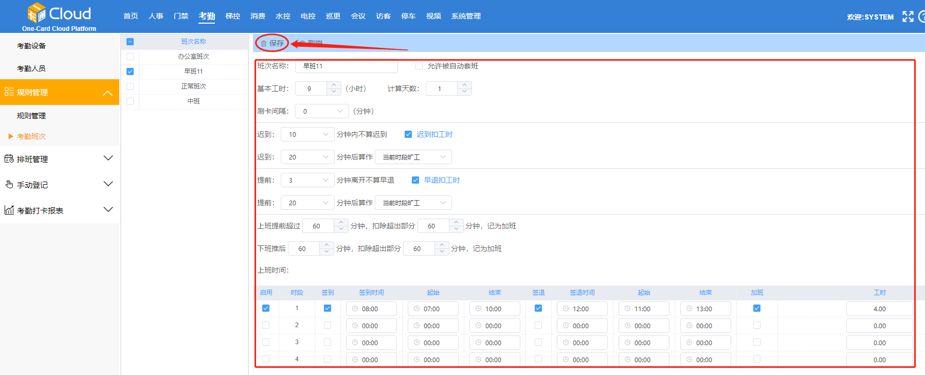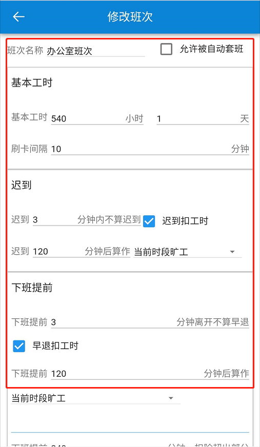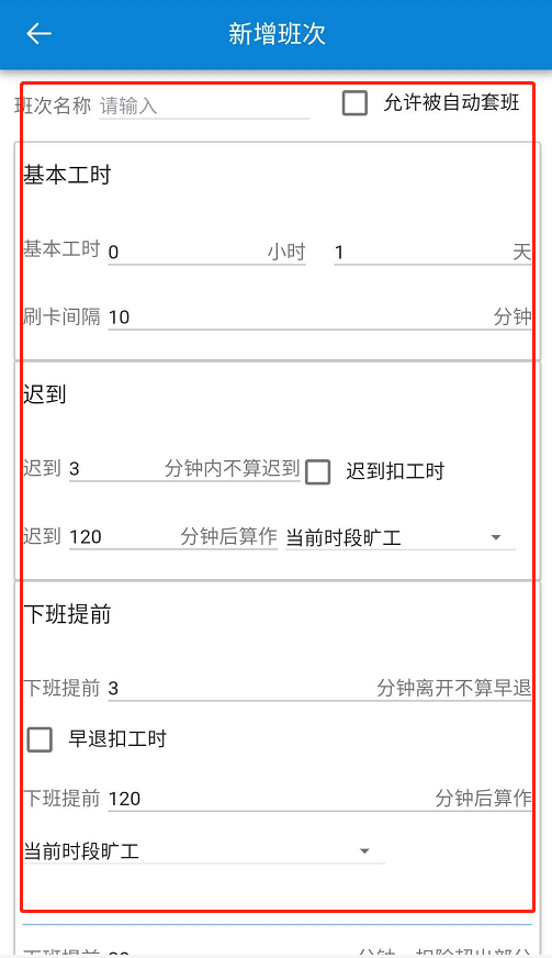 设置班次名称、基本工时、迟到、早退、加班等情况,以及可以设置具体的上下班时间,签到签退时间。