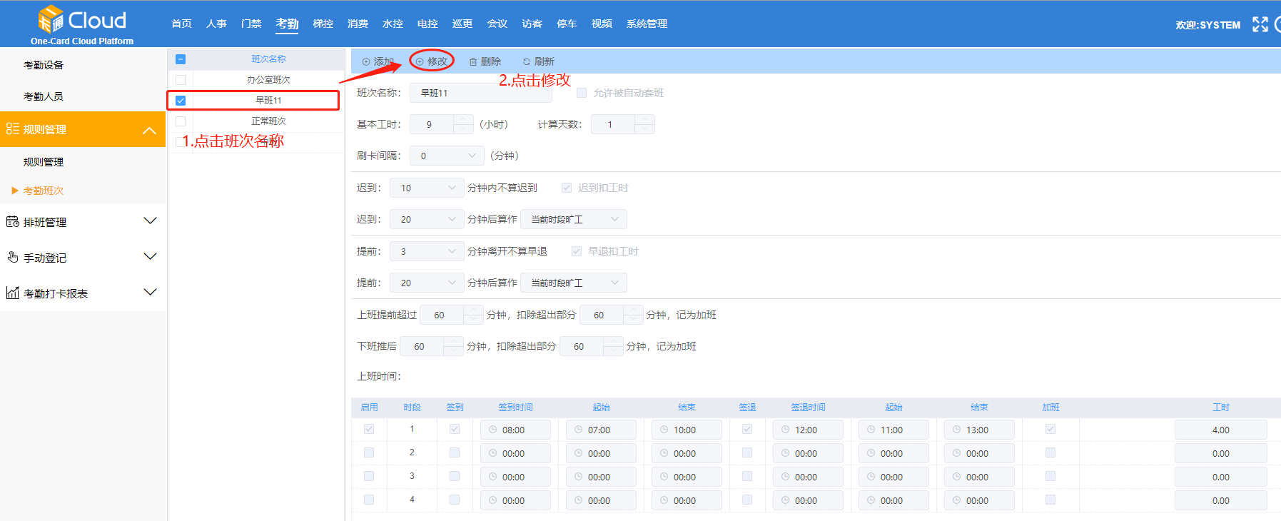 在【考勤班次】页面-点击班次名称(如图中早班11)-【修改】,即可编辑考勤班次参数。如图23-3所示: