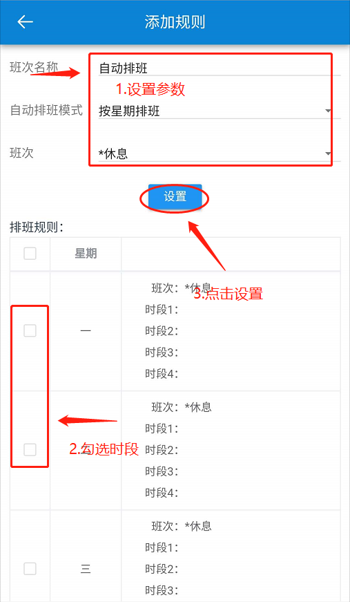 ● 按星期排班:在星期一-星期天七天中设置班次,排班时段。
