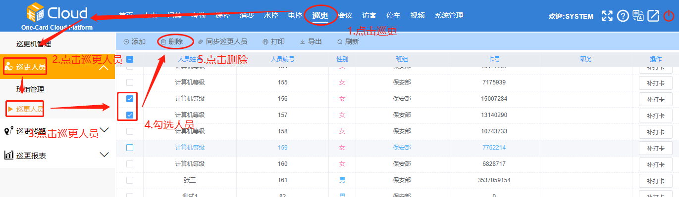 点击【巡更】-【巡更人员】-勾选人员-点击【删除】。如下图所示: