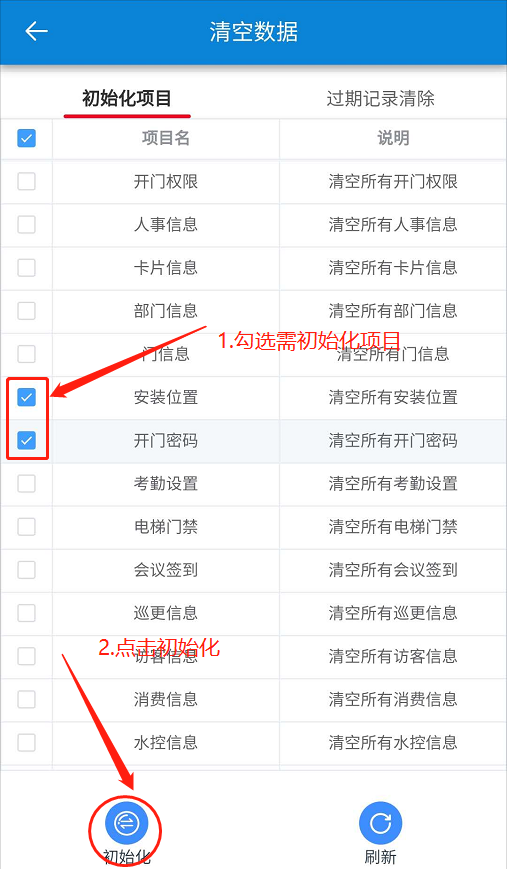 点击【系统】-【清空数据】-【初始化项目】-勾选需初始化项目-点击【初始化】;切换【过期记录清除】-设置清除日期、勾选清除项-点击【清空数据】。如下图所示: