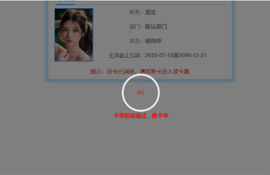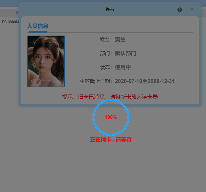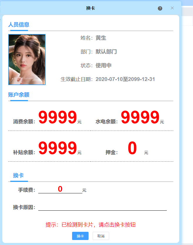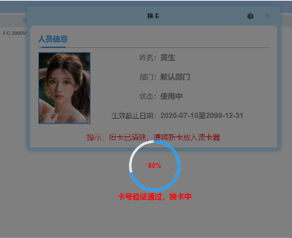 弹出换卡界面,待读取卡片信息后显示人员信息